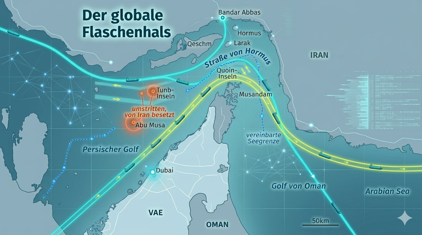 Wenn wir über Welthandel sprechen, denken wir oft an Containerriesen, Satellitenbilder von Hafenanlagen und abstrakte Milliardenwerte. Selten haben wir dabei eine ganz konkrete Stelle auf der Weltkarte vor Augen. Die Straße von Hormus ist genau so ein Ort: eine schmale Wasserstraße zwischen Iran im Norden und Oman bzw. den Vereinigten Arabischen Emiraten im Süden, an ihrer engsten Stelle gerade einmal gut 30 Kilometer breit. Trotzdem fließt hier seit Jahren ein Fünftel des weltweiten Öl‑ und Flüssiggas‑Handels hindurch, eine gewaltige Energiemenge, ohne die unsere Fabriken, Heizungen und Transportsysteme anders aussehen würden.