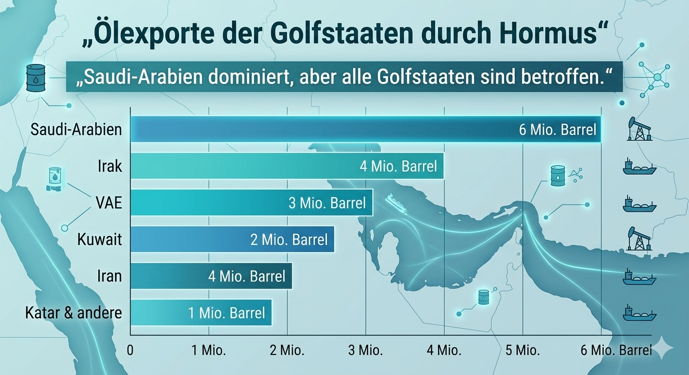 Die Golfstaaten selbst importieren über Hormus Konsumgüter, Maschinen und Chemikalien. Störungen treffen hier besonders hart, da sie auf externe Versorgung angewiesen sind.