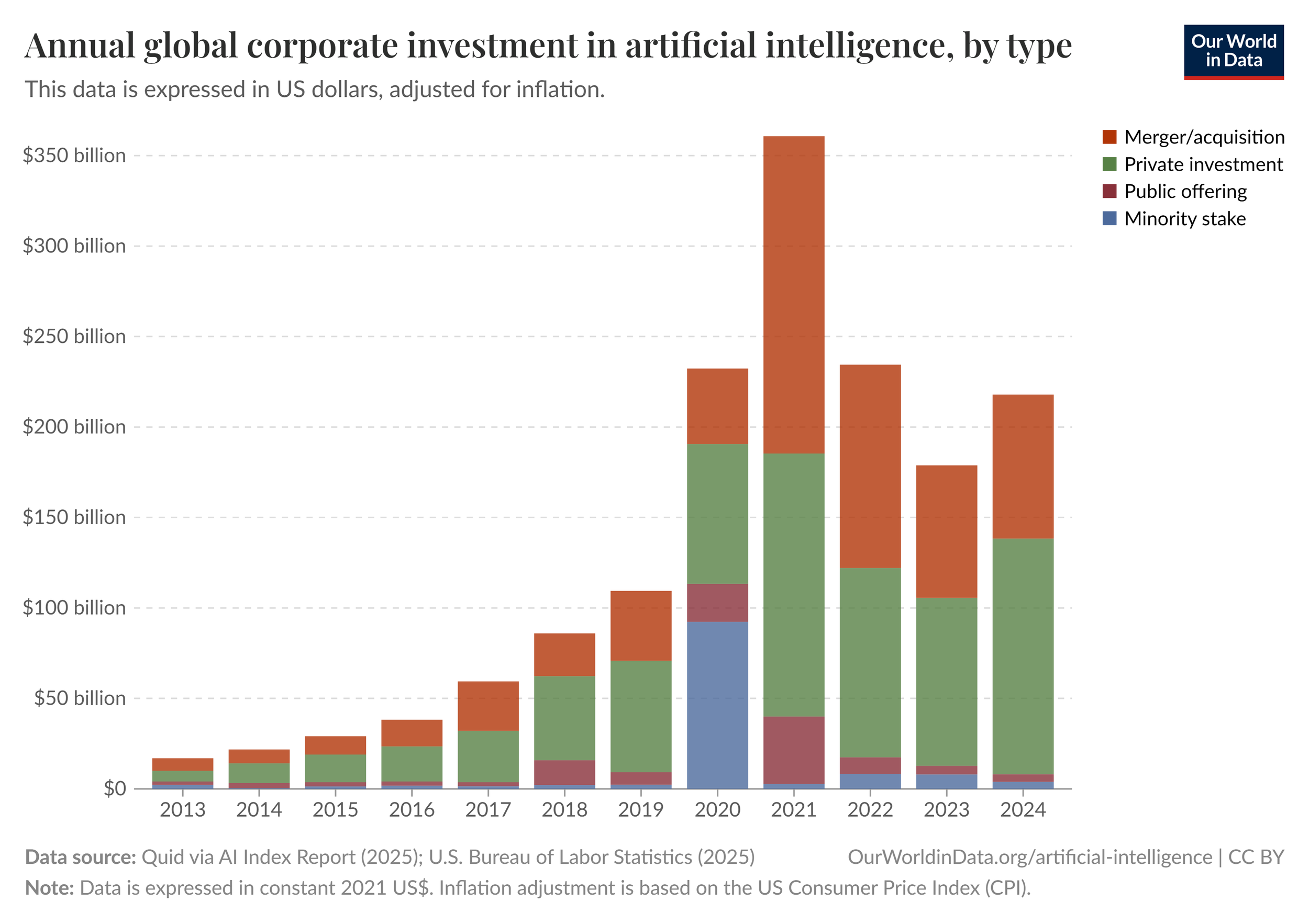 Quid via AI Index Report (2025); U.S. Bureau of Labor Statistics (2025) – with major processing by ourworldindata.org